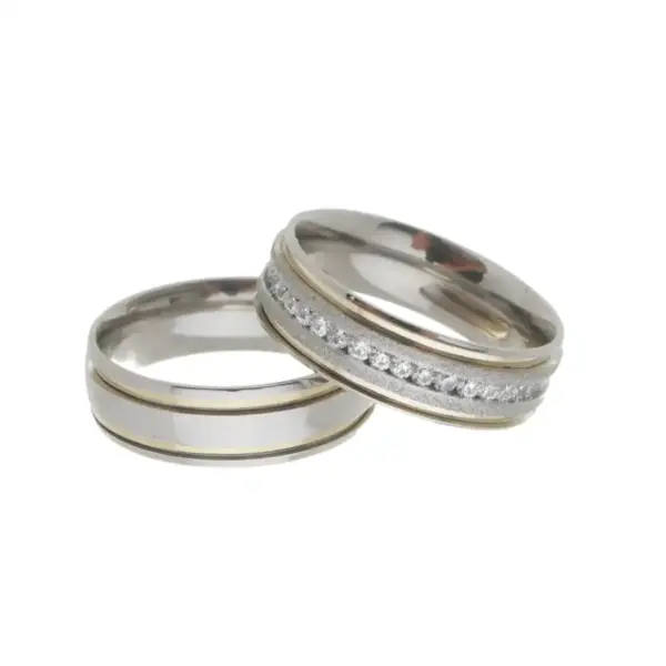 Descrição: Aliança de compromisso ou namoro, produzida em aço inox com cravação de 6 pedras de zircônia, frisos laterais e filete de ouro. Excelente durabilidade. Este material não oxida com o tempo como a prata, não demanda manutenção e é altamente resistente a riscos.