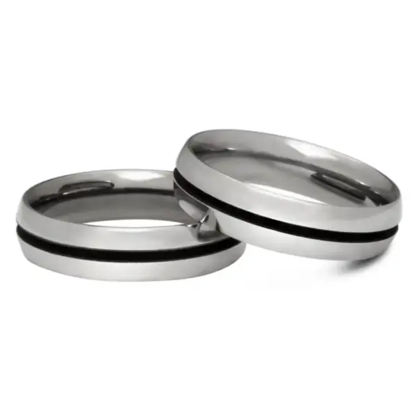 Descrição: Par de alianças produzido em aço inox, com 5 mm de espessura. Conforto anatômico, acabamento externo abaulado, com friso central no estilo “black”. Este modelo não possui cravação de pedras.