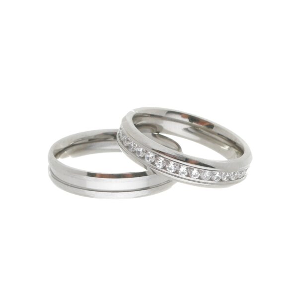Descrição: Aliança de compromisso ou namoro, exclusiva, produzida em aço inox. A aliança masculina tem acabamento abaulado, polido, com friso no centro. Na feminina ao invés do friso, temos pedras de zircônia cravadas no trilho. Excelente durabilidade. Este material não oxida com o tempo como a prata, não demanda manutenção e é altamente resistente a riscos.