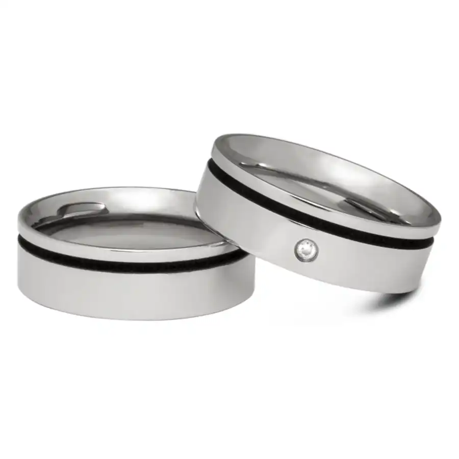 Descrição: Aliança de compromisso ou namoro, exclusiva, produzida em aço inox com 2 frisos pretos (canal black) nas laterais e trilho central com pedras de zircônia cravadas. Excelente durabilidade. Este material não oxida com o tempo como a prata, não demanda manutenção e é altamente resistente a riscos.