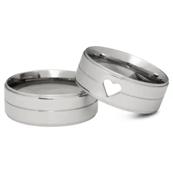 Descrição: Aliança de compromisso ou namoro, exclusiva, produzida em aço inox, reta, polida, com friso central e rebaixo nas laterais. E aliança feminina, acrescenta-se um lindo coração vazado.