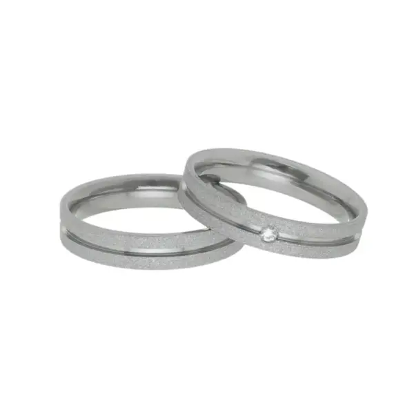 Aliança de compromisso ou namoro, exclusiva, produzida em aço inox. A aliança masculina tem acabamento reto, diamantado, com friso no centro. Na feminina no friso, temos uma pedra de zircônia cravada no centro. Excelente durabilidade. Este material não oxida com o tempo como a prata, não demanda manutenção e é altamente resistente a riscos.