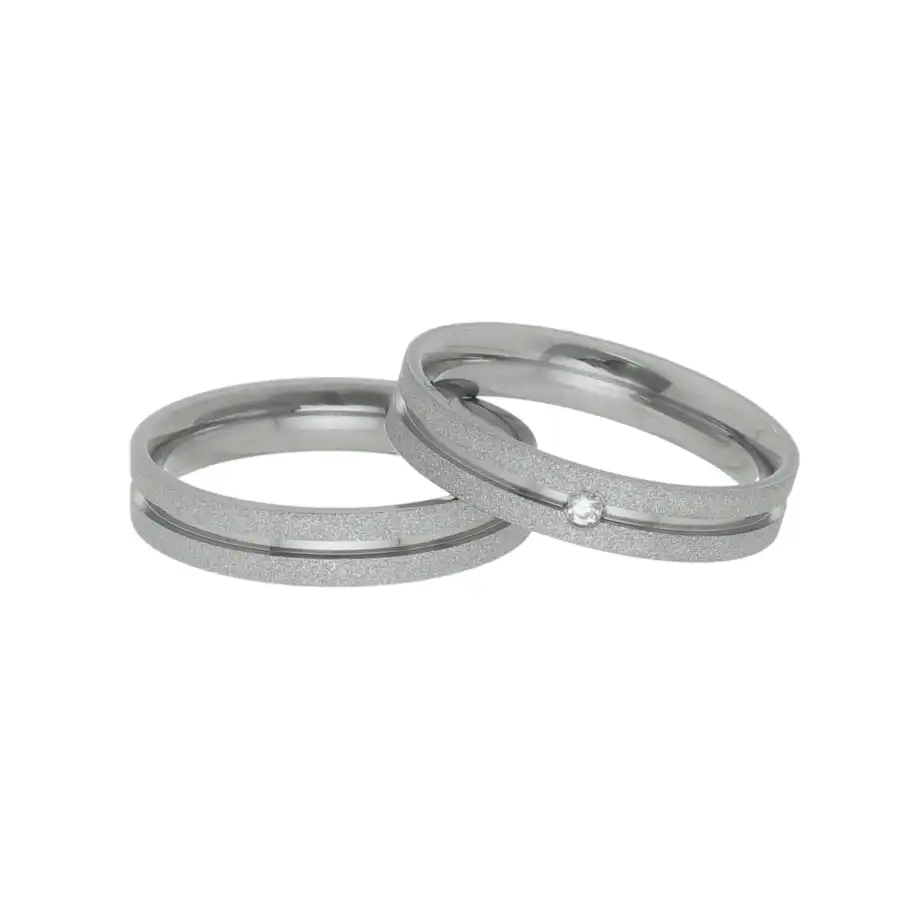 Par de alianças de compromisso ou namoro, exclusivas, produzidas em aço inox. As alianças tem acabamento reto, polido, com pedras de zircônia cravadas no trilho central. Excelente durabilidade. Este material não oxida com o tempo como a prata, não demanda manutenção e é altamente resistente a riscos.