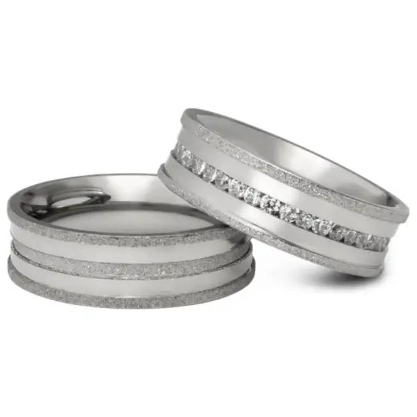 Descrição: Aliança de compromisso ou namoro, exclusiva, produzida em aço inox. A aliança masculina tem acabamento reto, polido, diamantada nas bordas em relevo e no friso central. Na feminina, se mantém as bordas diamantadas e substitui-se o friso por um trilho com pedras de zircônia cravadas no centro. Excelente durabilidade. Este material não oxida com o tempo como a prata, não demanda manutenção e é altamente resistente a riscos.