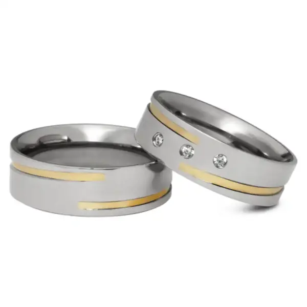 Acabamento externo: Másc: Reta, polida, com friso tipo rosca e filete de ouro | Fem: Reta, polida, com friso tipo rosca, filete de ouro e 3 pedra de zircônia cravadas