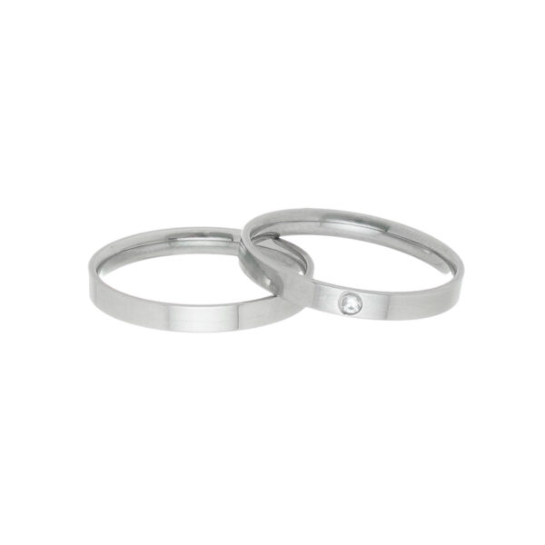 Descrição: Aliança de compromisso ou namoro, produzida em aço inox, reta, e pedra de zircônia cravada na aliança feminina. Excelente durabilidade. Este material não oxida com o tempo como a prata, não demanda manutenção e é altamente resistente a riscos.