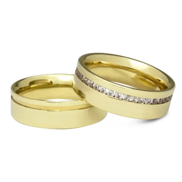 Acabamento Externo: Reta, polida, com friso (ou canaleta) na aliança masculina, e pedras de zircônia cravadas no trilho da aliança feminina.