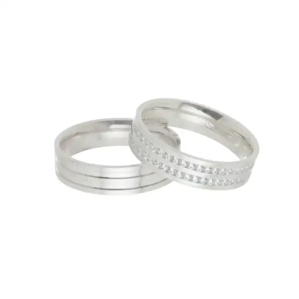 Aliança de compromisso ou namoro, exclusiva, produzida prata, masculina com 2 frisos e feminina com 2 canais com pedras de zircônia cravadas. Excelente durabilidade.