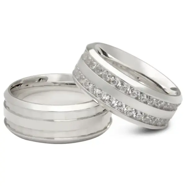 Aliança de compromisso ou namoro, exclusiva, produzida prata, masculina com 2 frisos e feminina com 2 canais com pedras de zircônia cravadas. Excelente durabilidade.
