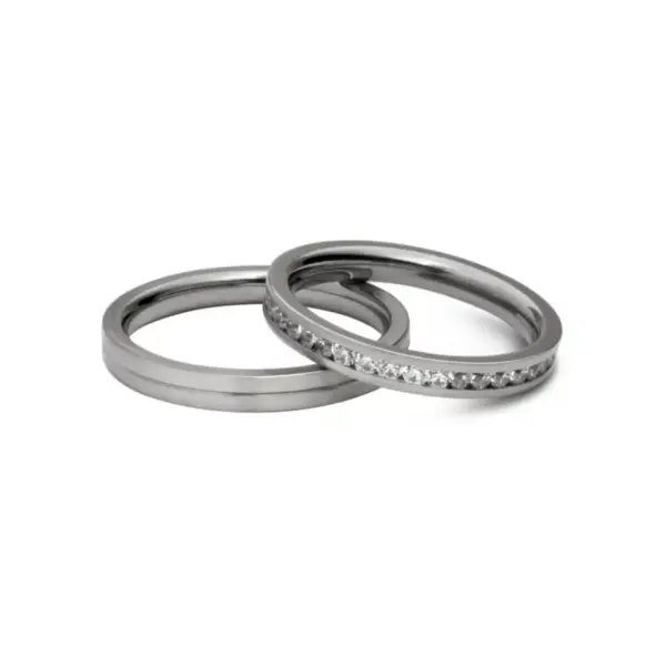 Acabamento externo: Másc.: Reta, polida, com friso no centro. | Fem.: Reta, polida, trilho de pedras de zircônias cravadas no centro.