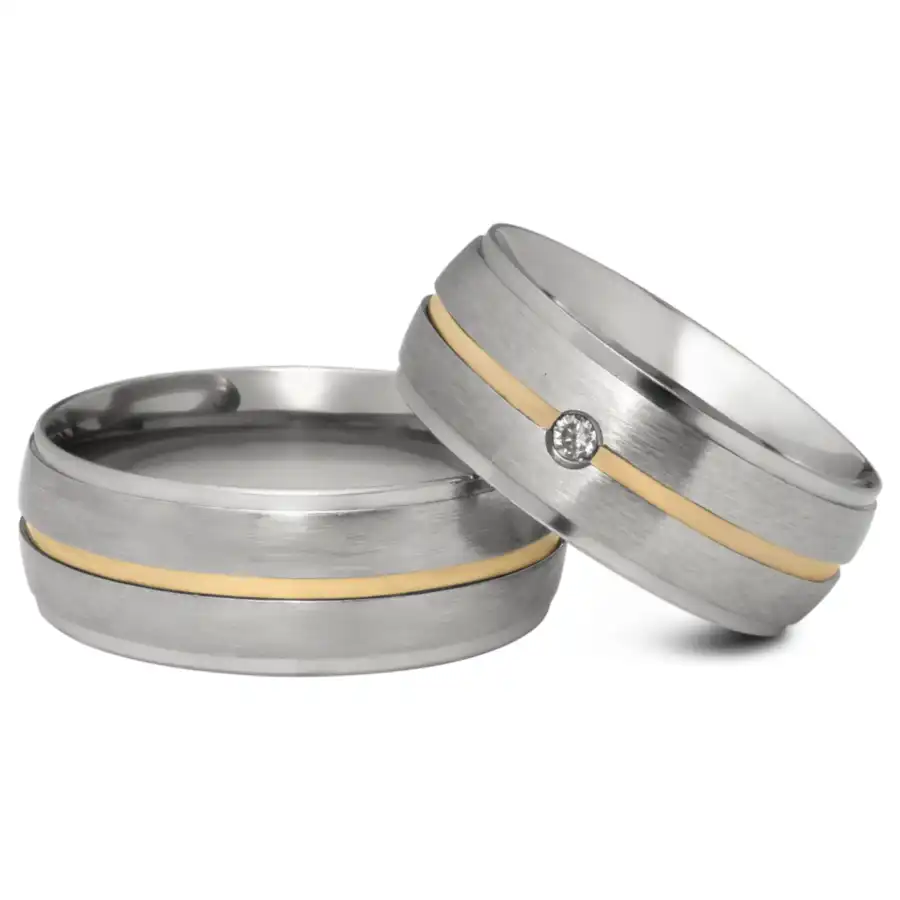 Acabamento externo: Másc: Reta, diamantada, 3 frisos com filetes de ouro. / Fem: Reta, diamantada, 3 frisos com filetes de ouro, 2 pedras de zircônia cravadas e coração vazado no centro.